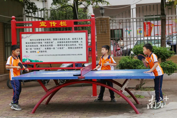 作为基层立法联系点的延伸,东泮村立法公园承担着立法宣传与互动的重要功能,通过打造具有特色的法治景观和设施,将法治元素融入到公园的环境和设施之中,让市民在休闲娱乐的同时,潜移默化地接受法治文化的熏陶,增强法治意识和法治观念。在立法公园的立法文化长廊,坐在长椅上休憩的群众一抬头便可以看到《中华人民共和国民法典》、宪法、刑法、《村民委员会组织法》等法律法规的介绍,了解李悝、商鞅等古代法治人物的事迹;在村里河涌边打造的富有揭阳古城元素的《揭阳立法历程》时光墙上,散步的群众可以依次了解揭阳自2015年获得地方立法权以来已经制定出台的《揭阳市扬尘污染防治条例》《揭阳市重点流域水环境保护条例》《揭阳古城保护条例》等地方性法规;而在公园的体育运动区域里,立着一排排法律宣传栏与标语,儿童们通过翻动“法律谜语”“法律名词”等旋转铭牌,就可以在趣味中学习法律知识。