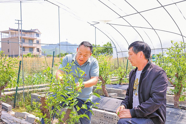 张雄富(左)在小甜枣种植基地向村民了解枣树生长情况。资料图片