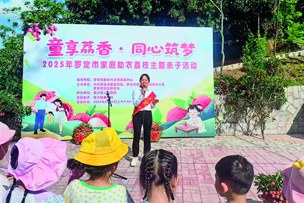6月25日,李小兰代表在采摘荔枝活动中向大家宣讲荔枝知识。(代表供图)