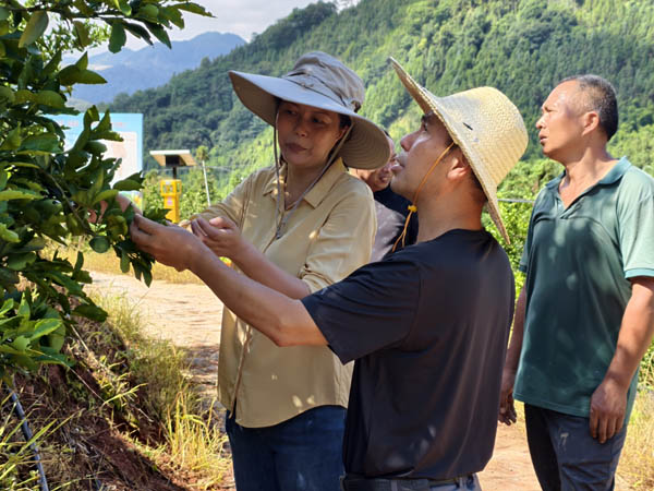 顺昌县人大代表谢蓉(左一)在柑橘园指导果农