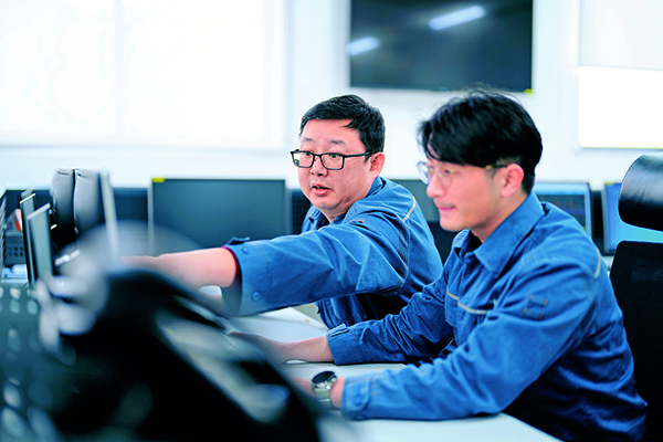 周敬余代表(左一)在指导同事核实设备运行参数。