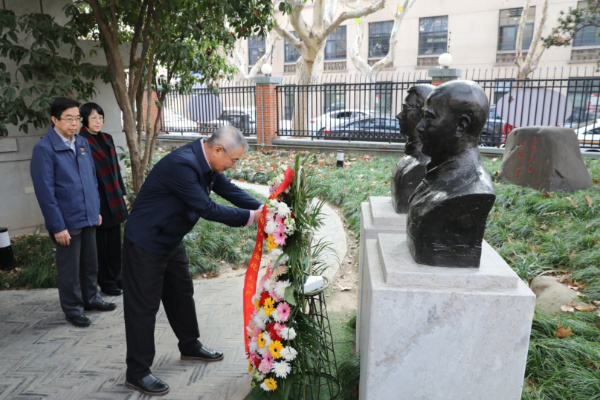 80年前,中国民主促进会在上海中国科学社(今陕西南路235号)正式宣告成立。民进成立旧址纪念馆外,全体同志一起向民进主要创始人马叙伦、王绍鏊的铜像敬献花篮。蔡达峰上前仔细整理挽带,全体同志深情凝视,气氛肃穆、情思绵长。