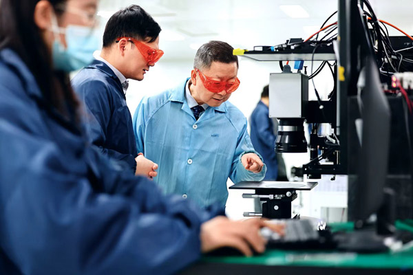 马新强代表(右一)和技术人员在讨论半导体激光加工装备国产化推进情况。(代表供图)