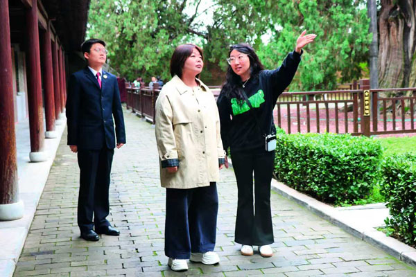 10月19日,刘盼代表(中)在陕西省白水县仓颉墓,与白水县检察院检察官一起进行“回头看”,仔细查看树龄超5000年的仓颉手植柏生长情况。(代表供图)
