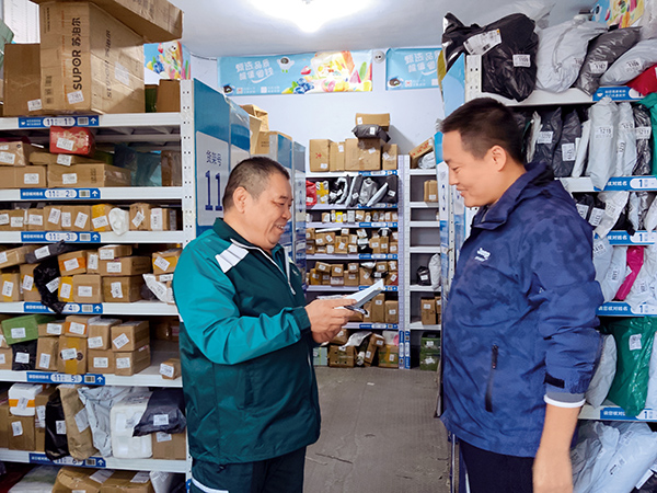 郭红岗代表(左)正在和快递网点负责人交流。摄影/李华