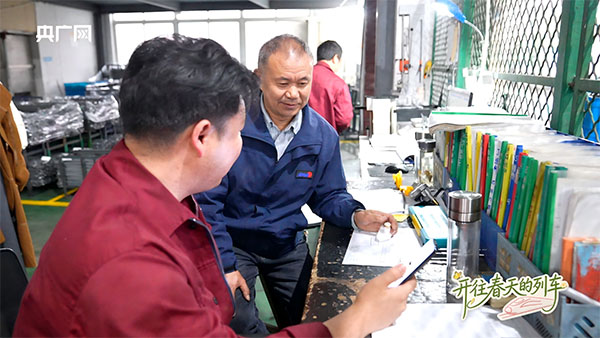 李安锐(左一)指导工友生产工序细节把控(央广网发 贾洁楠 摄)