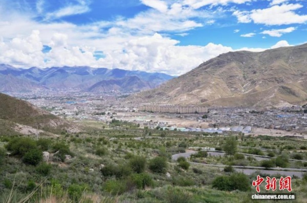 2025年7月16日,从西藏拉萨娘热沟俯瞰,南北山的绿色植被环抱拉萨城区。中新社记者 张祥毅 摄