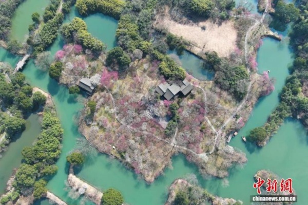 2025年2月18日,航拍浙江杭州西溪湿地的梅林。(无人机照片) 中新社记者 王刚 摄