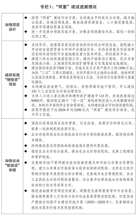 二是“两重”建设接续推进。强化“两重”性质、坚持自上而下、注重软硬结合,高质量推进国家重大战略和重点领域安全能力项目建设。加快“硬投资”项目实施,安排超长期特别国债8000亿元,支持1459个重大项目,督促加快开工建设,推动形成更多实物工作量。建立超长期贷款配套支持“两重”建设工作机制,加大项目融资支持力度。加力推进规划编制、政策制定、体制机制创新等“软建设”配套措施,完善项目投融资和价费、工程建设管理和运行管护等机制。