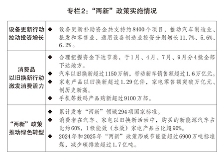 一是消费市场扩容升级亮点纷呈。实施提振消费专项行动,社会消费品零售总额增长3.7%。汽车销量突破3440万辆,新能源汽车销量达到1649万辆、增长28.2%。降低住房贷款首付比例、个人住房公积金贷款利率,引导商业性房贷利率下降,支持提取住房公积金用于支付购房首付款。智能可穿戴设备、扫地机器人、无人机等产品消费势头良好。即时零售、直播电商等持续发展,全年网上零售额、快递业务量分别增长8.6%、13.6%。深入推动新能源汽车、绿色智能家电等下乡,乡村消费品零售额增长4.1%。开展服务消费提质惠民行动、促进健康消费专项行动,增开银发旅游列车,服务零售额增长5.5%。支持影视、动漫、舞台艺术等领域精品创作,有序延长热门文博场馆、旅游景区营业时间,支持举办“苏超”、“浙BA”、“冰超”等大众体育赛事,促进冰雪经济发展。支持首发经济,打造国货“潮牌”、“潮品”,推动全国中华老字号扩围至1450个。探索建立中小学春秋假制度。积极扩大入境消费,全年入境游客15450万人次、入境游客总花费1311亿美元,分别增长17.1%、39.2%。优化离境退税政策,离境退税商品销售额增长近一倍。