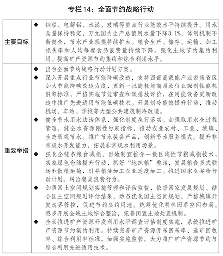 三是全面节约战略实施成效明显。统筹推进“能水粮地矿材”一体化节约。有力有效管控高耗能高排放项目,深入实施重点领域节能降碳专项行动,加快存量项目改造升级和依规淘汰,制修订24项能效能耗强制性国家标准,扣除原料用能和非化石能源消费量后的单位国内生产总值能耗降低5.1%。建立健全农业节水增效、工业节水减排、城镇节水降损制度体系,加强再生水等非常规水利用,万元国内生产总值用水量下降4%左右。深入开展粮食节约和反食品浪费行动,强化全链条粮食减损和餐饮行业反浪费。大力发展循环经济,加快构建废弃物循环利用体系,提高资源综合利用水平,废钢铁、废有色金属等10种主要再生资源回收量超过4亿吨,大宗固体废物综合利用率超60%,主要资源产出率进一步提高。