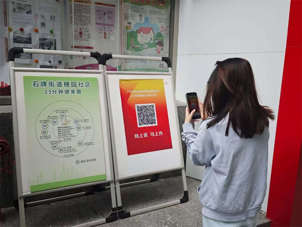 居民在石牌街道穗园片区代表联络站门口扫描联络站二维码 图/羊城晚报记者 柳卓楠 摄
