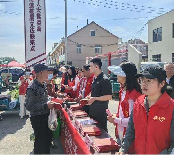 潍坊市人大常委会深入践行全过程人民民主重大理念,充分发挥基层立法联系点“直通车”作用,着力夯实立法民意基础。图为人大代表在寒亭区固堤街道基层立法联系点开展普法宣传活动。