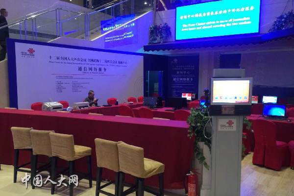 2月27日,设在北京梅地亚中心的2016年全国两会新闻中心正式启用,中心工作人员开始接待和安排中外记者采访。中国人大网 向航 摄