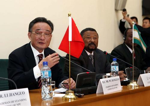 11月10日,正在埃塞俄比亚进行正式友好访问的中国全国人大常委会委员长吴邦国在位于亚的斯亚贝巴的非盟总部会见非盟委员会主席让·平(左二)。这是双方在会谈。新华社记者 刘卫兵 摄