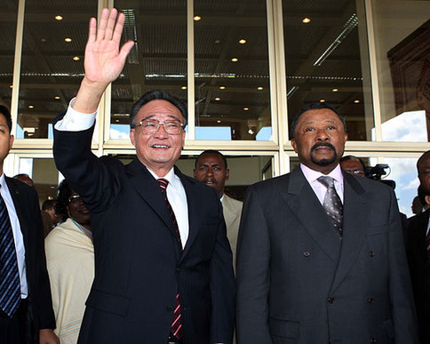 1月10日,正在埃塞俄比亚进行正式友好访问的中国全国人大常委会委员长吴邦国在位于亚的斯亚贝巴的非盟总部会见非盟委员会主席让·平。这是吴邦国抵达非盟总部大楼时,向欢迎的人们挥手致意。新华社记者 刘卫兵 摄