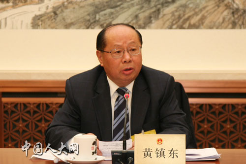 12月27日下午,十一届全国人大常委会第三十次会议举行分组会议,审议商标法修正案草案、土地管理法修正案草案。图为全国人大常委会委员黄镇东在分组会上发言。中国人大网 包瓴瓴 摄