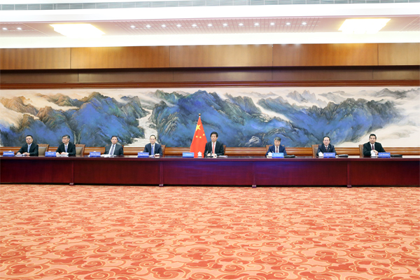 1月25日,全国人大常委会委员长栗战书在北京人民大会堂以视频方式同伊朗议长卡利巴夫举行会谈。毕楠 摄