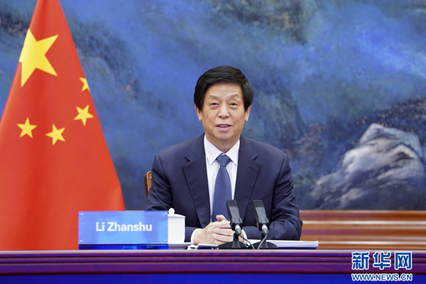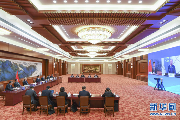 3月17日,全国人大常委会委员长栗战书在北京人民大会堂以视频方式同哈萨克斯坦议会下院议长尼格马图林举行会谈。新华社记者 张领 摄