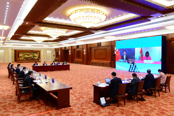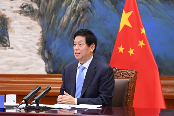 全国人大常委会委员长栗战书24日在北京人民大会堂以视频方式同基里巴斯议长里特举行会谈。马增科 摄