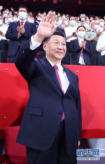 6月28日晚,庆祝中国共产党成立100周年文艺演出《伟大征程》在国家体育场盛大举行。习近平、李克强、栗战书、汪洋、王沪宁、赵乐际、韩正、王岐山等党和国家领导人,同约2万名观众一起观看演出。新华社记者 鞠鹏 摄