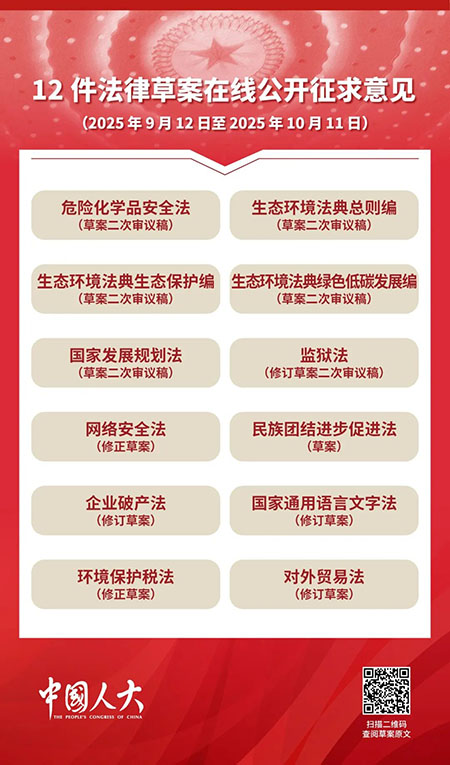 今天起,12件法律草案公开征求意见,截止日期为2025年10月11日。您可以登录中国人大网(www.npc.gov.cn)、国家法律法规数据库(flk.npc.gov.cn)提出意见,也可以将意见寄送全国人大常委会法制工作委员会(北京市西城区前门西大街1号,邮编:100805。信封上请注明××法律草案征求意见)。