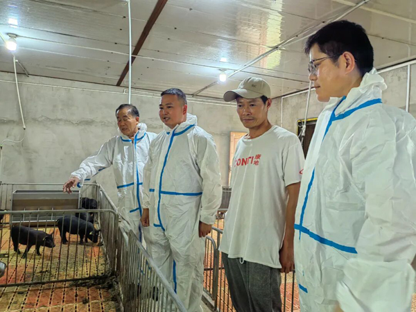 郑培坤代表(左二)与华中农业大学专家察看梅花星黑毛猪的选育情况。摄影/刘倩