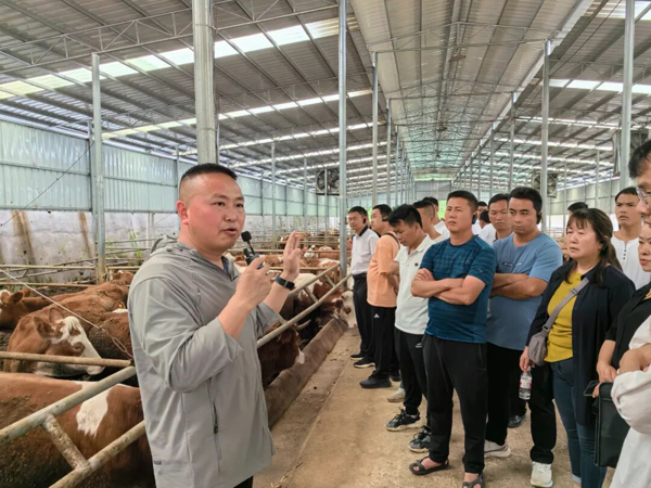郑培坤代表在塔山村养牛基地给养牛培训班学员作现场讲解。摄影/唐艺桓