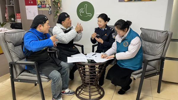 2025年1月15日,重庆沙坪坝基层立法联系点的立法信息员与社区民警用手语向聋哑人经营户征集对《中华人民共和国民营经济促进法(草案)》的意见建议。(全国人大常委会法工委基层立法联系点办公室供图)