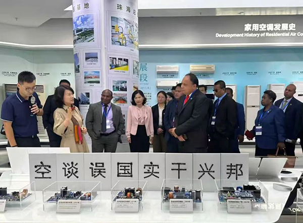 全国人大代表、珠海格力电器股份有限公司董事长董明珠向萨摩亚议长奥阿帕乌(前排右一)展示“中国智造”的硬核实力。摄影/张玮琦
