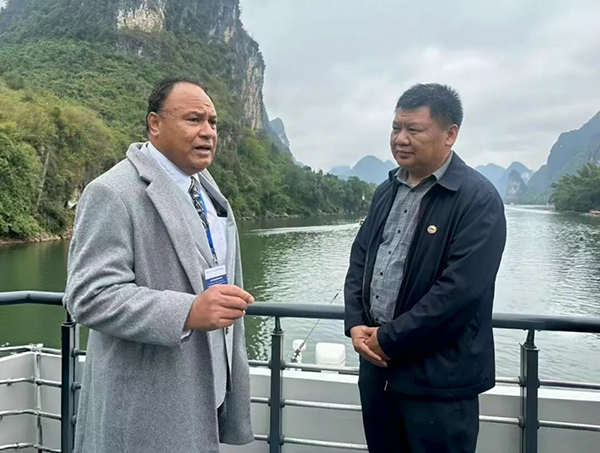 萨摩亚议长奥阿帕乌向全国人大代表汤建伟了解漓江的绿色发展。摄影/张玮琦
