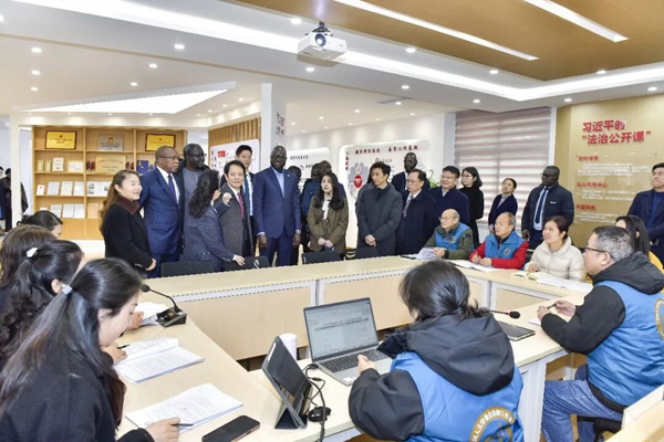 图为恩迪亚耶议长率团参访重庆市沙坪坝区石井坡街道中心湾社区基层立法联系点,现场观摩立法意见征询会议。摄影/唐安冰