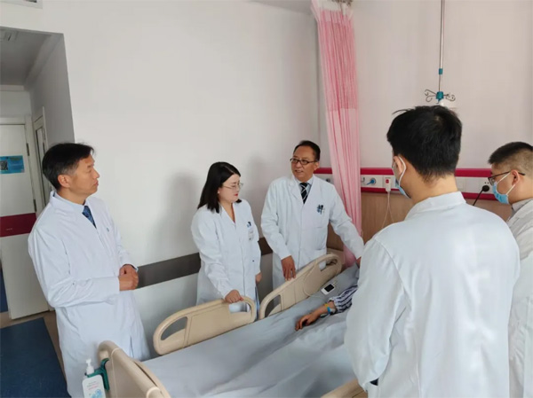 李龙倜代表(左二)和主治医生一起在病房了解患者康复情况。摄影/江珊
