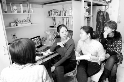 北京师范大学法学院研二学生谷芳卿(右二)和舍友们边听总理作政府工作报告边讨论。本报记者王斯敏摄