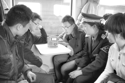 3月5日,在沈阳北开往大连的K7382次列车上,沈阳客运段列车长刘瑞与旅客们认真收听温家宝总理所作的政府工作报告。本报特约记者刘勇摄