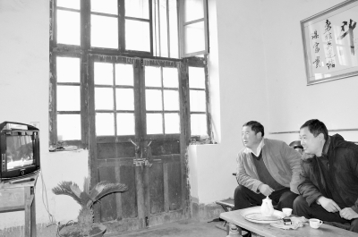 3月5日上午,山东沾化下洼镇杨营村村民丁培科(左)和下洼镇农业综合服务中心办公室主任王建军在收看温家宝总理作政府工作报告。本报记者 何平摄