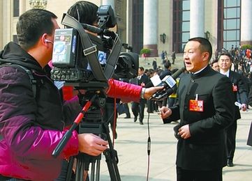 全国人大代表、信阳市长乔新江与刘文新代表接受中央电视台采访。