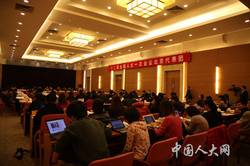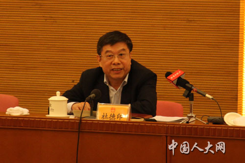 3月9日上午,北京代表团在驻地举行全体会议,审议全国人大常委会工作报告。图为杜德印代表在会议上发言。王芳 摄