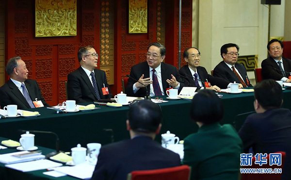 3月5日,中共中央政治局常委、全国政协主席俞正声参加十二届全国人大四次会议湖北代表团的审议。 新华社记者丁海涛摄