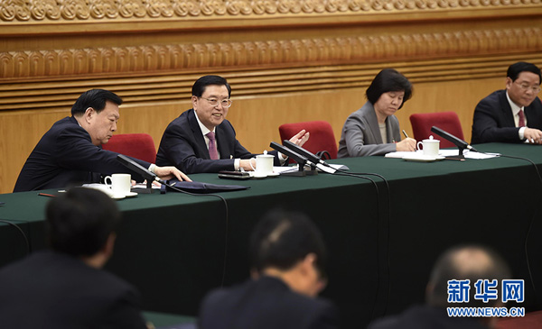 3月5日,中共中央政治局常委、全国人大常委会委员长张德江参加十二届全国人大四次会议浙江代表团的审议。 新华社记者张铎摄