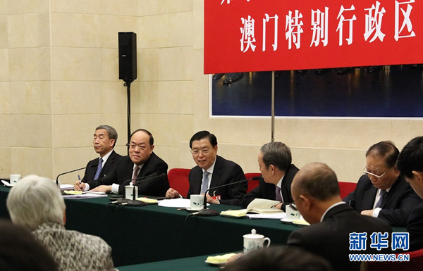 3月6日,中共中央政治局常委、全国人大常委会委员长张德江参加十二届全国人大四次会议澳门代表团的审议。新华社记者 刘卫兵 摄