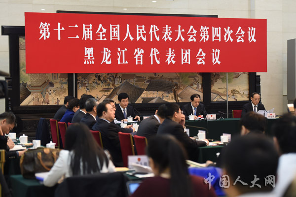 3月6日,十二届全国人大四次会议黑龙江代表团举行全体会议,审议政府工作报告。罗荣 摄