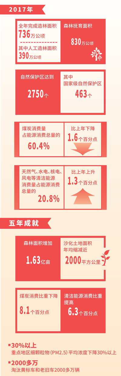 这是一张赏心悦目的答卷:5年来,单位国内生产总值能耗、水耗均下降20%以上,主要污染物排放量持续下降,重点城市重污染天数减少一半,森林面积增加1.63亿亩……绿色发展进展可喜。