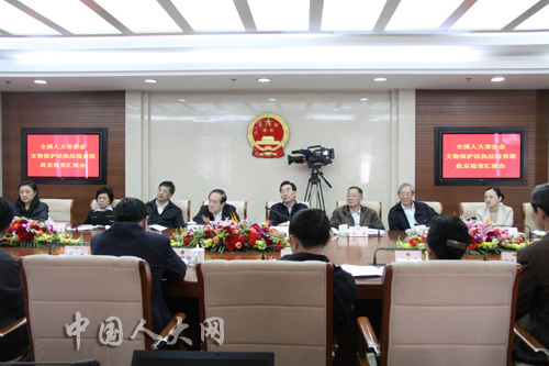 在北京市检查期间,执法检查组召开座谈会,听取了北京市贯彻实施《文物保护法》的汇报,并围绕这次执法检查的重点内容,与有关方面进行座谈,听取各方面的意见、建议。检查组还实地检查了故宫博物院的馆藏文物保护情况,明十三陵永陵和茂陵的修缮情况,圆明园含经堂遗址的考古发掘情况,历代帝王庙、孔庙和国子监博物馆的文物保护单位腾退和修缮后的合理利用情况,国家博物馆的文物展品保护情况等。(人口卫生体育室 温会兵)