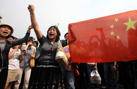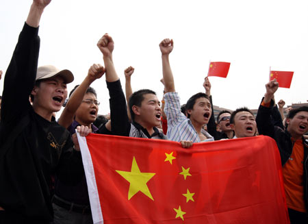 People shout slogans "Cheer up, China!", "Cheer up, Wenchuan!" after a three-minute silent tribute to quake victims, at the Tian'anmen Square in central Beijing, capital of China, May 19, 2008. China began on May 19 a three-day national mourning for the people dead in the 8.0-magnitude quake hitting southwest and northwest China. (Xinhua/Wang Yongji) |