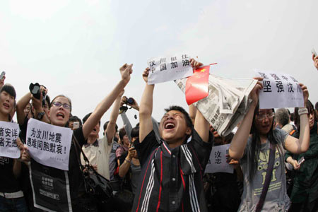 People shout slogans "Cheer up, China!", "Cheer up, Wenchuan!" after a three-minute silent tribute to quake victims, at the Tian'anmen Square in central Beijing, capital of China, May 19, 2008. (Xinhua/Wang Yongji) |