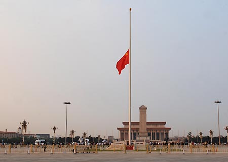 China's national flag flies at half-mast at people's square in Guiyang, southwest China's Guizhou Province, May 19, 2008. China on Monday begins a three-day national mourning for the tens of thousands of people killed in a powerful earthquake which struck the country's southwestern regions on May 12.((Xinhua Photo)