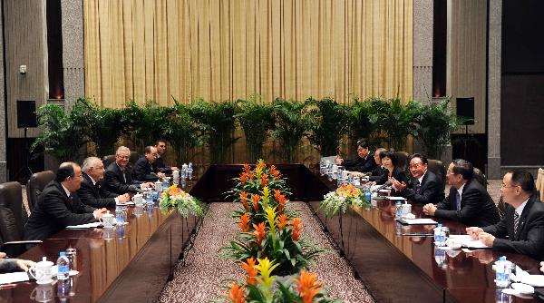 Wu Bangguo (3rd R), chairman of the Standing Committee of China's National People's Congress, China's top legislature, meets with Abdelouahed Radi (2nd L), chairman of the Chamber of Representatives of Morocco, who is here attending the ceremony for the China National Pavilion Day at the World Expo Park in Shanghai, east China, Oct. 1, 2010. (Xinhua/Li Tao)