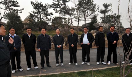 Top Chinese leaders Hu Jintao (5th R), Wu Bangguo (4th R), Wen Jiabao (5th L), Jia Qinglin (3rd R), Li Changchun (4th L), Xi Jinping (2nd R), Li Keqiang (3rd L), He Guoqiang (1st R), and Zhou Yongkang (2nd L) take part in tree planting at the Olympic Forest Park in Beijing, capital of China, April 5, 2008. |