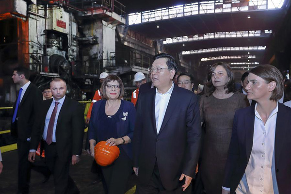 Zhang Dejiang, chairman of the Standing Committee of China's National People's Congress (NPC), visits a steel mill during his official friendly visit to Serbia, July 17, 2017. (Xinhua/Ju Peng)